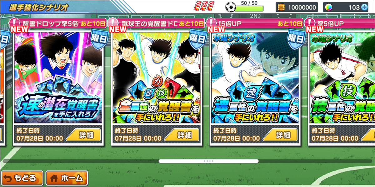 こんな感じの画面が開くんだけど、ここで、選手強化の素材のロベルトノートや覚醒書が手に入るよ!